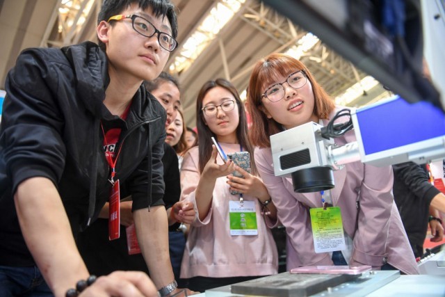 2017年5月25日,参加第17届中国哈尔滨国际装备制造业博览会的展商在演示激光打标技术。为期三天的展会吸引了国内外700余家企业参展。
