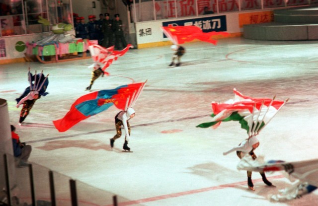 在哈尔滨举行的第三届亚冬会开幕式上,大型艺术表演《太阳·冰雪·亚细亚》中,十余名速滑运动员背插代表各参赛国家和地区的旗帜,绕场疾速滑行。