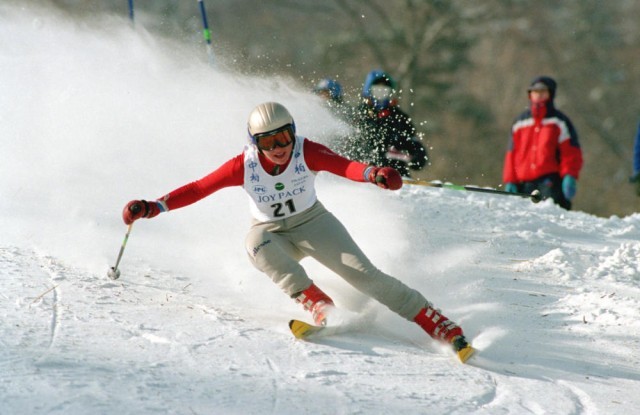 在第三届亚冬会上,乌兹别克斯坦女选手亚历山大诺娃·叶卡捷在高山滑雪女子大回转比赛中。