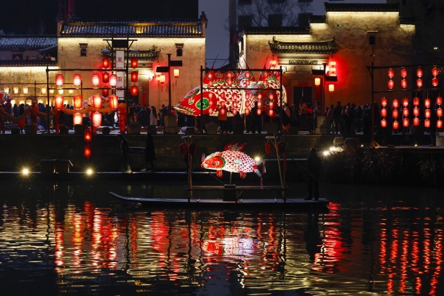 2025年1月15日,鱼灯表演队伍在安徽省黄山市徽州区呈坎村巡游。CICPHOTO/施亚磊 摄