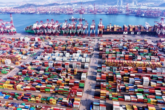 这是2月23日拍摄的山东港口青岛港外贸集装箱码头(无人机照片)。2025年以来,青岛港开通2条到东南亚、地中海方向的“一带一路”航线,合计新开4条国际集装箱航线,加快世界一流海洋港口建设。新华社发(俞方平 摄)