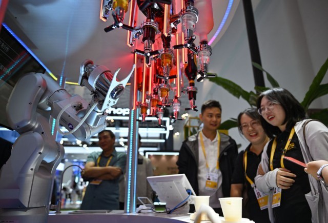 4月14日,消博会上展示的一款机器人在调酒。