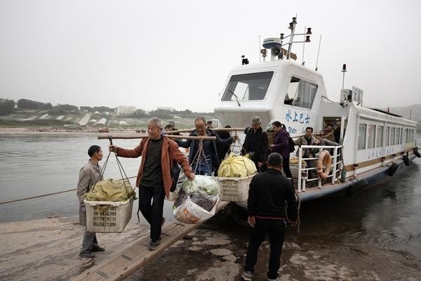 2025年4月13日,重庆巴南区大溪口客渡,渡轮到达岸边,中坝岛的村民们挑着蔬菜下船,准备搭车到城区卖菜。中坝岛是重庆的蔬菜种植基地之一,四面环江的地形让村民卖菜的背篓只能完全依靠长江渡轮运送到市区。因此,这条长江轮渡线也被称为“背篓航线”。