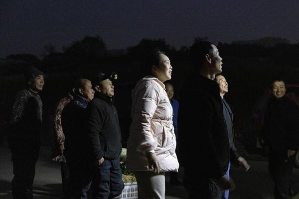 2024年12月22日清晨,重庆巴南区中坝岛,蔬菜货车上的灯光将人们的面庞照亮。