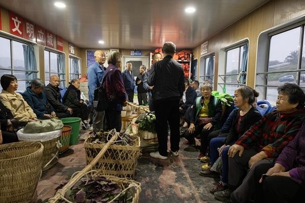 2025年4月13日,重庆巴南区,村民们在船舱内交谈。