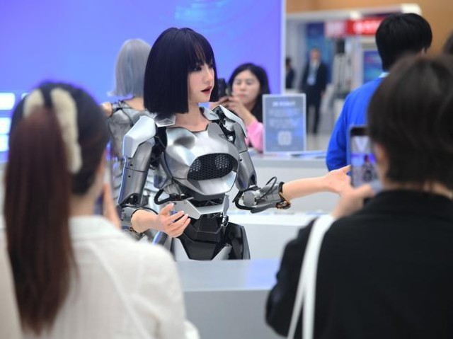 仿生人形机器人在2024中关村论坛年会会场设置的咨询台“迎宾”(2024年4月27日摄)。新华社记者 任超 摄