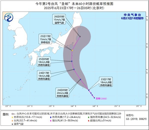 央视网消息:据中央气象台消息,今年第2号台风“圣帕”(热带风暴级)的中心今天(23日)下午5点钟(北京时,下同)位于日本东京南偏东方约1120公里的洋面上,就是北纬26.2度、东经143.5度,中心附近最大风力有8级(18米/秒),中心最低气压为998百帕,七级风圈半径80-260公里。