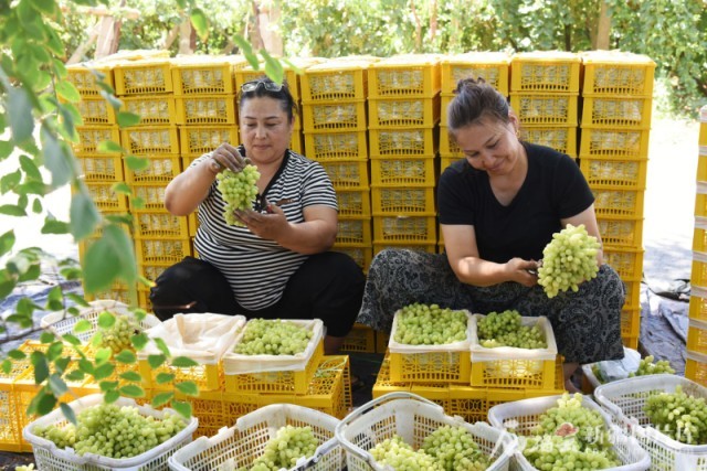 7月7日,吐鲁番市63万亩葡萄迎来成熟季,种植户忙着将采摘下来的葡萄装箱发货。刘健摄