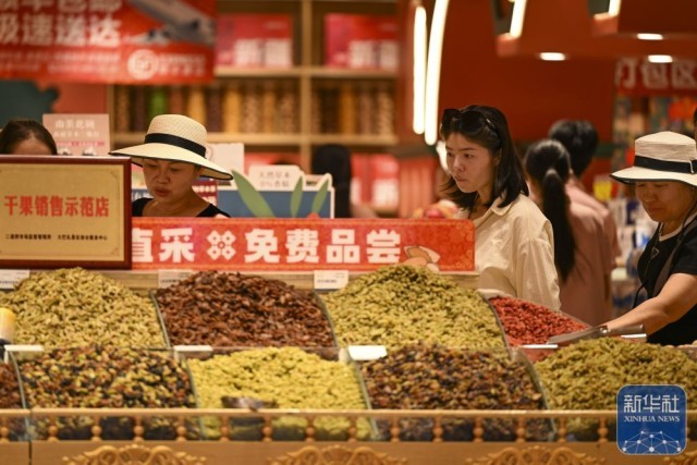 ↑ 8月21日,游客在乌鲁木齐大巴扎步行街选购干果。