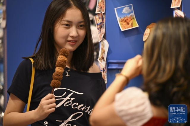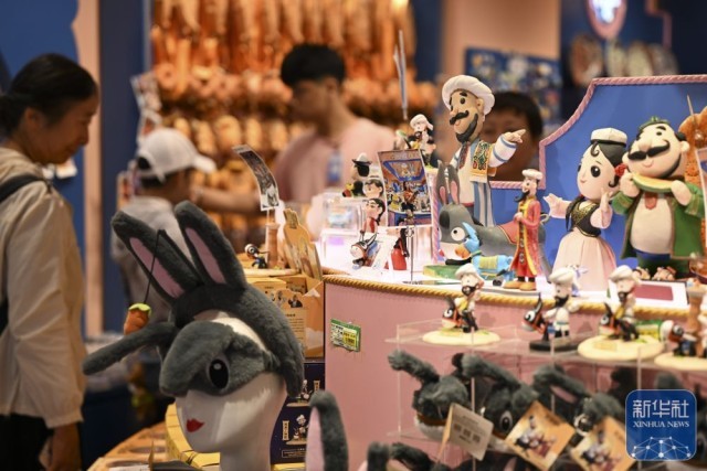 ↑ 8月21日,游客在乌鲁木齐大巴扎步行街选购文创产品。