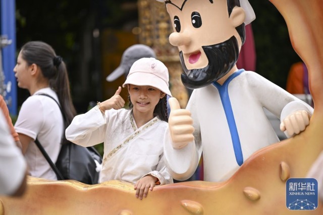 ↑ 8月21日,小游客在乌鲁木齐大巴扎步行街拍照留影。