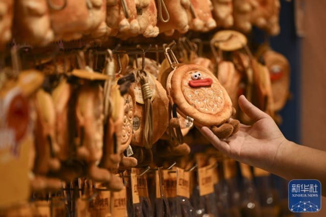 ↑ 8月21日,在乌鲁木齐大巴扎步行街,游客手持文创产品拍照留影。