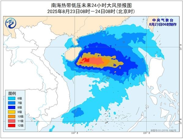 大风预报:8月23日08时至24日08时,南海大部海域、巴士海峡、黄岩岛附近海域、西沙群岛、琼州海峡、广东沿海、海南沿海将有6-8级大风,南海中部偏北和南海北部的部分海域风力有9-10级,台风中心经过的附近海域风力可达11-12级、阵风13-14级。
