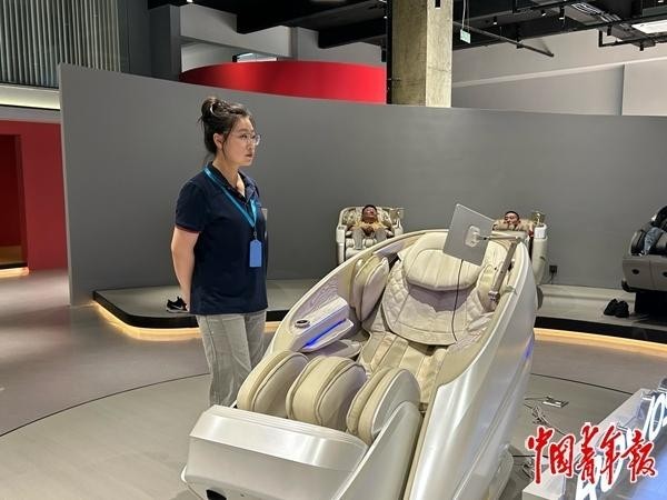 近日,福建荣耀健康科技股份有限公司展厅,顾客正在体验公司生产的智能按摩椅。中青报·中青网记者 贾骥业/摄