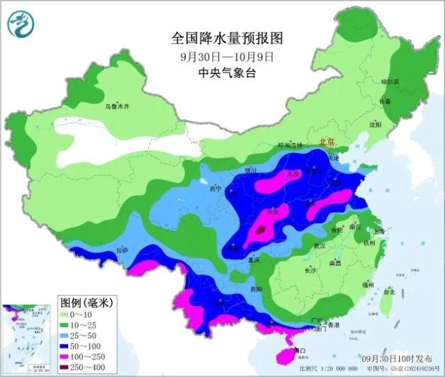 其中最强降雨时段为10月1日至2日,四川东北部至山东南部、苏皖北部等地将出现成片的强降雨,尤其是四川东北部、陕西西南部、河南东部、江苏北部局地有大暴雨。
