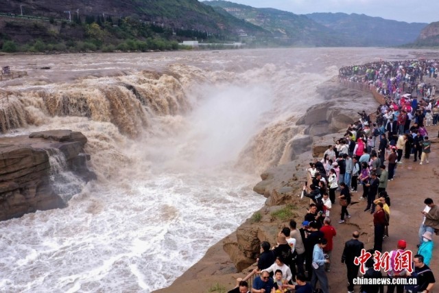 10月3日,大批游客在黄河壶口瀑布景区游览观瀑。当日是国庆中秋假期第三天,位于山西吉县和陕西宜川县交界的黄河壶口瀑布景区迎来假期客流高峰。(无人机照片)