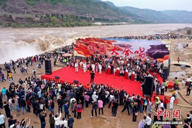 10月3日,游客在黄河壶口瀑布景区参与演唱《黄河大合唱》。(无人机照片)