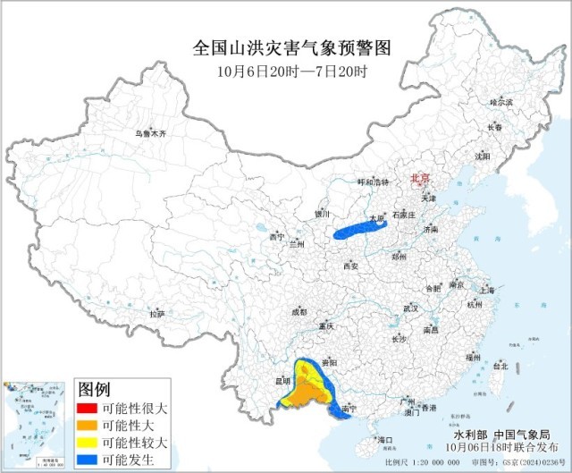 央视网消息:水利部和中国气象局10月6日18时联合发布橙色山洪灾害气象预警:预计,10月6日20时至7日20时,广西西部、贵州西南部、云南东部等地部分地区发生山洪灾害可能性较大(黄色预警),其中,局地发生山洪灾害可能性大(橙色预警)。其他地区也可能因局地短历时强降水引发山洪灾害,请各地注意做好实时监测、防汛预警和转移避险等防范工作。
