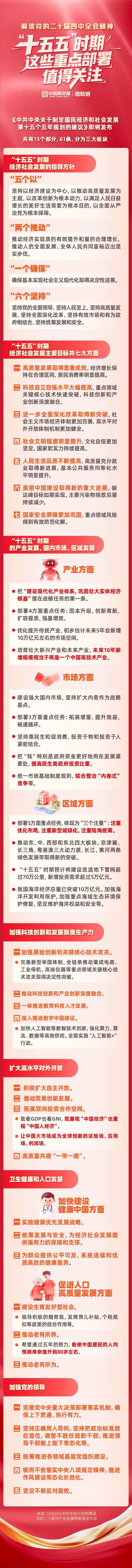 10月24日,中共中央举行新闻发布会,介绍和解读党的二十届四中全会精神。发布会上亮点频出:既重视“中国经济”也重视“中国人经济”,提高民生类政府投资比重,让中国大市场成为全球创新的试验场,未来五年将中国居民的人均预期寿命提升到80岁左右……“十五五”时期,还有哪些重点方面值得期待,一图读解?