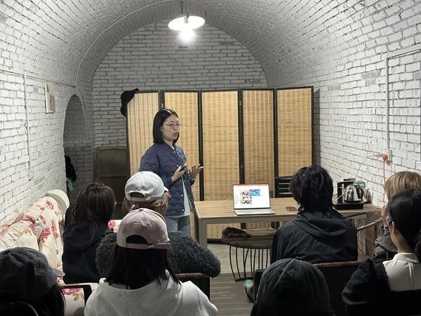 4月13日,河南省巩义市,中央美术学院思政课教师吝莹莹在窑洞内给同学们讲授《薪火丹青:红色美术经典的时代新解与青年价值寻踪》思政课。受访者供图