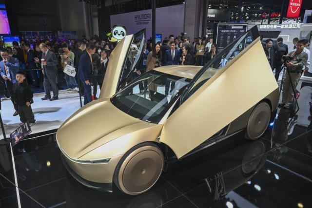 11月6日,这是特斯拉公司展台上展出的特斯拉Cybercab赛博无人驾驶电动车,这是该车型的亚太首展。新华社记者 陈浩明 摄