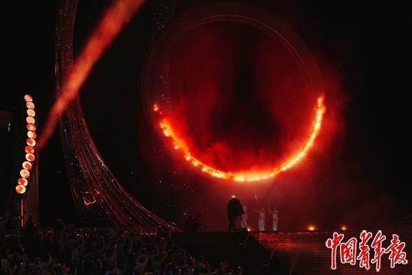 11月9日,广东广州,广东奥体中心体育场,第十五届全国运动会开幕式上,男子100米亚洲纪录保持者、广东名将苏炳添,两届奥运会击剑冠军、香港选手张家朗携手来自澳门的第19届亚运会武术长拳金牌得主李祎,共同点燃主火炬。中青报·中青网记者 李隽辉/摄