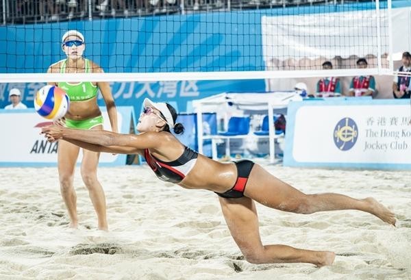 11月8日,第十五届全国运动会沙滩排球女子组决赛在香港维多利亚公园沙滩排球场举行,福建队组合薛晨/曾津津以2∶1战胜南京体育学院队组合严旭/周明利,夺得冠军。图为福建队的薛晨(黑衣)在比赛中救球。视觉中国供图