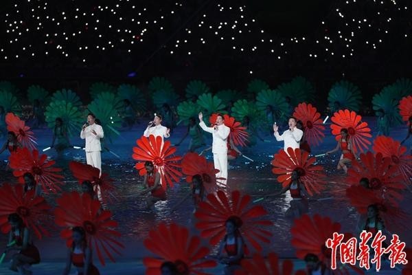 11月9日,广东广州,广东奥体中心体育场,第十五届全国运动会开幕式上,香港歌手(左至右)林晓峰、陈小春、谢天华、钱嘉乐共同演绎经典歌曲。中青报·中青网记者 李隽辉/摄