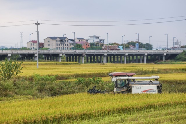 这是10月22日,收割机在浙江省金华市金东区塘雅镇万亩良田示范区收割水稻。新华社记者 徐昱 摄