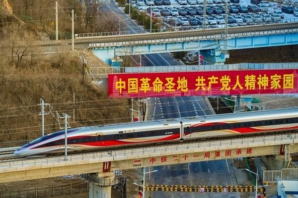 12月26日,一列复兴号列车在西延高铁疾驰,途中掠过“中国革命圣地 共产党人精神家园”的红色标语。刘一江/摄