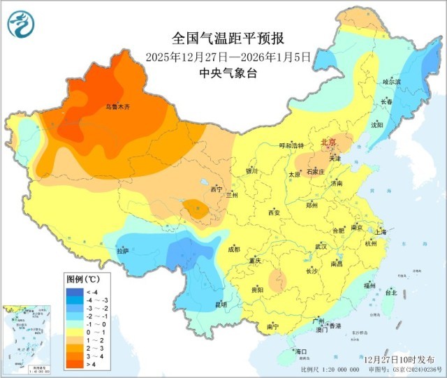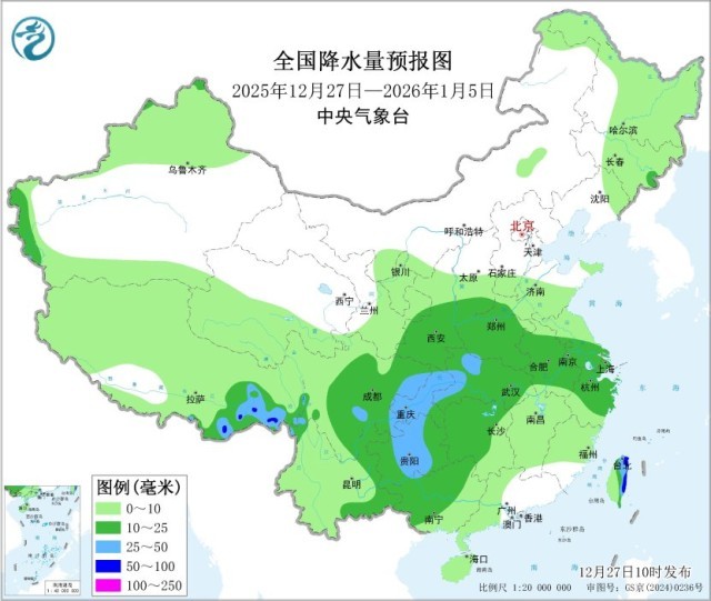 未来10天(12月27日至2026年1月5日),新疆北部和西南部、陕西南部、黄淮西部、江淮西部、江汉、江南西部和北部、西南地区东部及西藏东南部、华南西部等地累计降水量有8~20毫米,其中四川盆地东部、河南西南部、湖北西部、贵州、台湾及西藏东南部等地部分地区有25~40毫米,局地超过50毫米;上述大部地区累计降水量较常年同期偏多3~7成,局地偏多1倍以上,我国其余大部地区降水偏少。