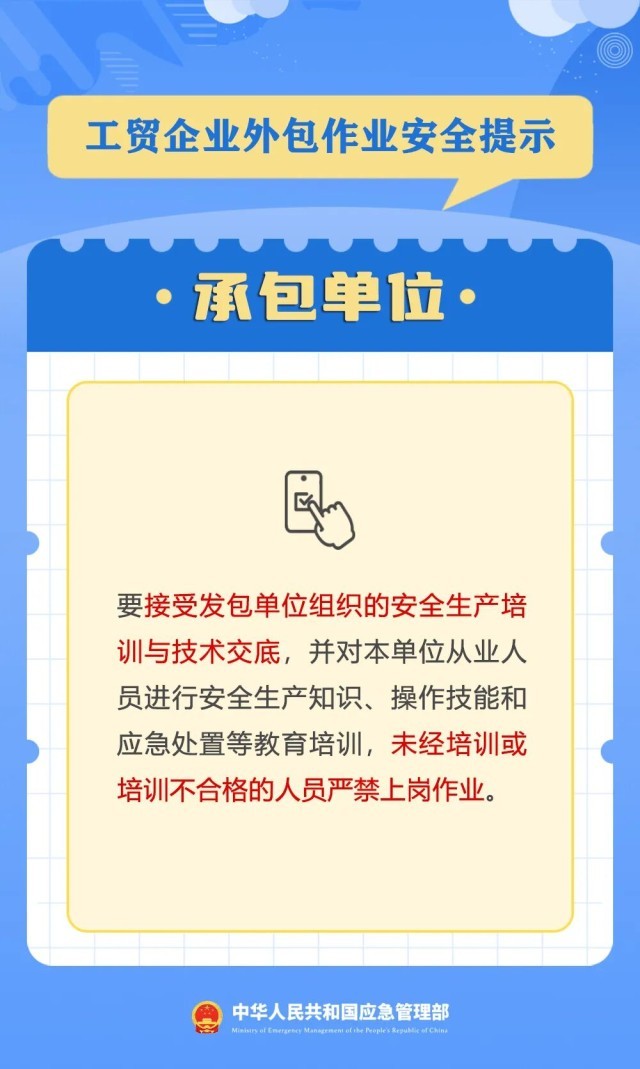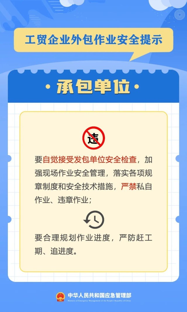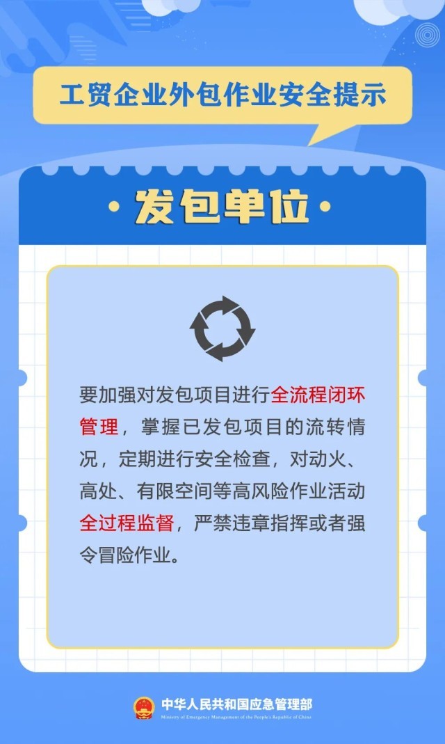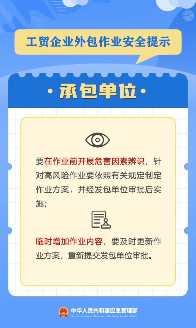 央视网消息:据应急管理部消息,2025年10月以来,全国工贸企业共发生3起较大生产安全事故,均是由于外包作业漏管失控导致,教训十分深刻。为推动各地和相关企业加强外包作业安全管理,有效防范遏制事故发生,应急管理部向工贸企业发出外包作业安全提示。