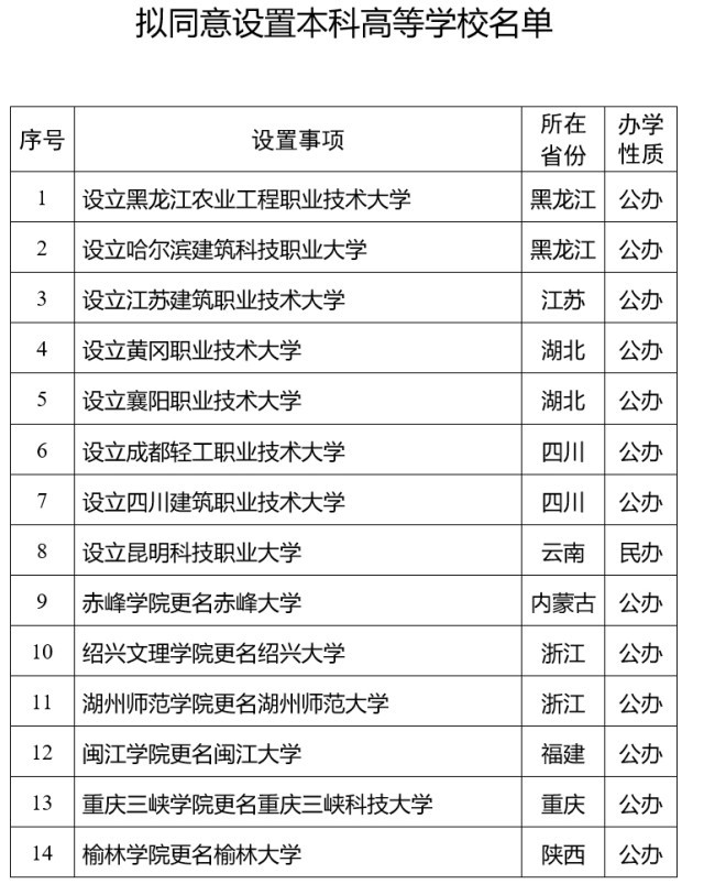 央视网消息:据中华人民共和国教育部网站消息,教育部发展规划司发布关于拟同意设置本科高等学校的公示,拟同意设置黑龙江农业工程职业技术大学等14所学校。