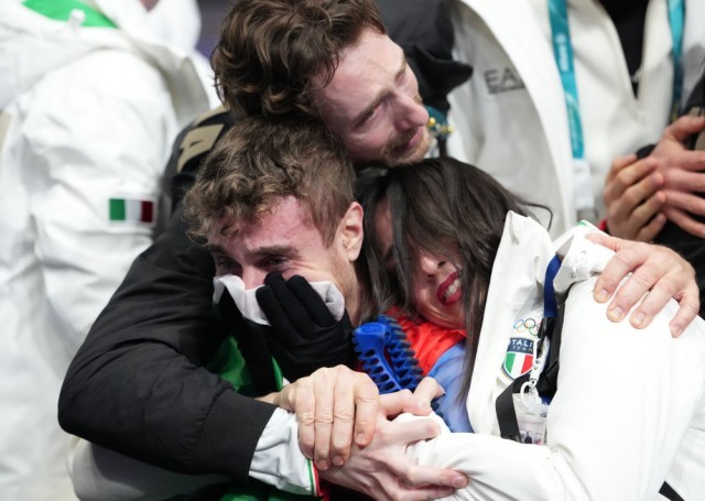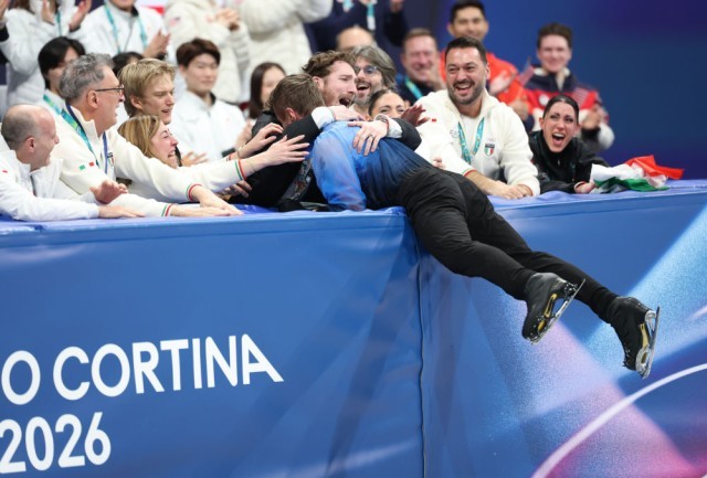 2月8日,意大利队选手里佐在花样滑冰项目团体赛男单自由滑完赛后。新华社记者 李明 摄