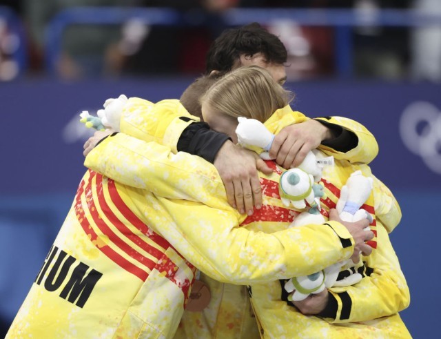 2月10日,季军比利时队在短道速滑混合团体接力颁奖仪式上庆祝。新华社记者 李明 摄