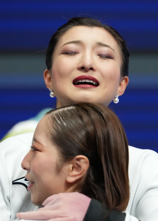 2月8日,日本队选手坂本花织(上)在花样滑冰团体赛女单自由滑比赛后。新华社记者 薛宇舸 摄