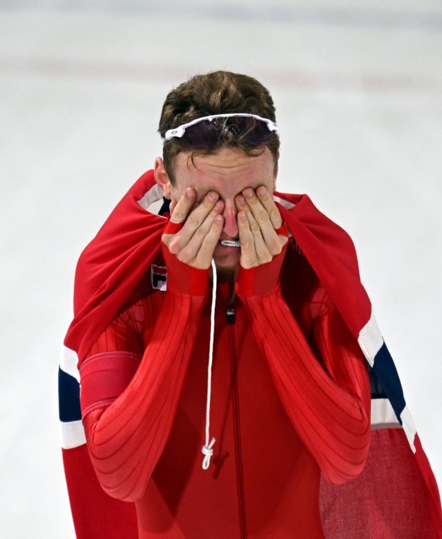 2月8日,挪威选手桑德尔·艾特雷姆在速度滑冰男子5000米夺冠后。新华社记者 武巍 摄