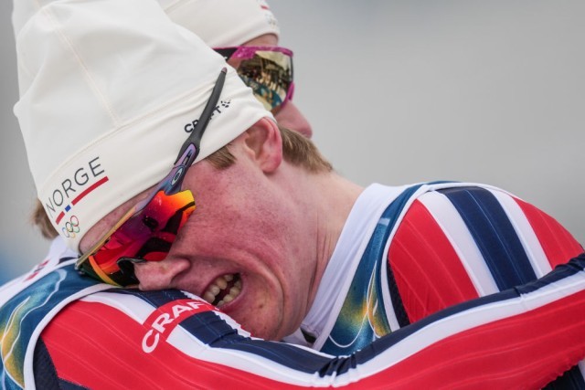 2月10日,获得越野滑雪男子个人短距离(传统技术)季军的挪威选手维凯(右)与获得冠军的队友克莱博拥抱时喜极而泣。新华社记者 彭子洋 摄