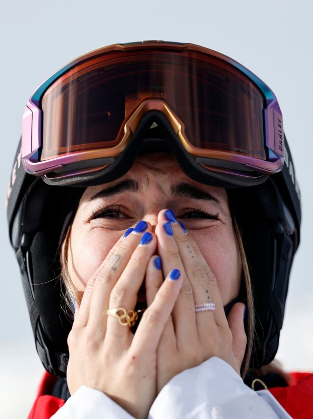 2月9日,瑞士选手玛蒂尔德·格雷莫德在自由式滑雪女子坡面障碍技巧决赛中庆祝夺冠。新华社记者 张宏祥 摄