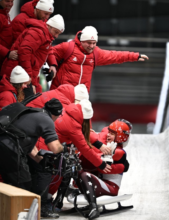 2月11日,德国选手达亚娜/玛格达莱娜在雪橇女子双人赛后庆祝。新华社记者 丁旭 摄