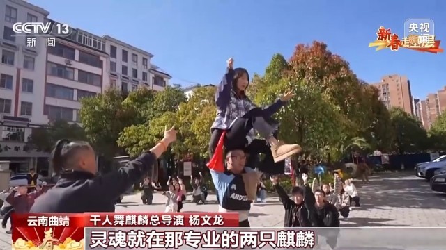 杨文龙:“灵魂”就在那专业的两只麒麟把位上和高空的托举,还有旋转。云大学生做技巧,看点就出来了。年轻人参与就是让千人舞麒麟传承做好,精气神才能展现出来,是一种力量,是一种青春,是拼搏和奋斗的一种诠释。