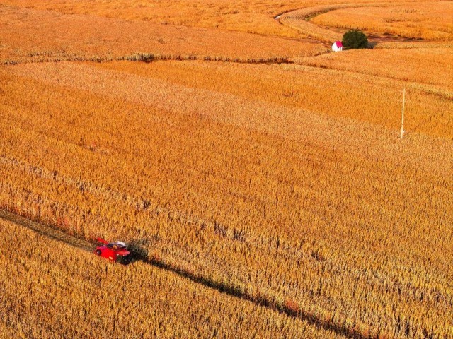 农机手驾驶收割机在内蒙古自治区通辽市科尔沁区丰田镇收割玉米(2025年10月14日摄,无人机照片)。“十四五”时期,粮食总产量由2021年的1.37万亿斤增至2025年的1.43万亿斤,连续两年站稳在1.4万亿斤的台阶。