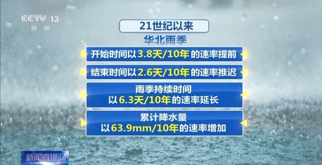 国家气候中心气候预测室首席预报员支蓉介绍,雨季当中,趋势性特征相对更为明显的是华北雨季。2025年华北雨季开始偏早,结束偏晚,持续时间和累计雨量均位列1961年以来历史第一。21世纪以来,华北雨季开始时间以3.8天/10年的速率提前,结束时间以2.6天/10年的速率推迟,雨季持续时间以6.3天/10年的速率延长,累计降水量以63.9mm/10年的速率增加。