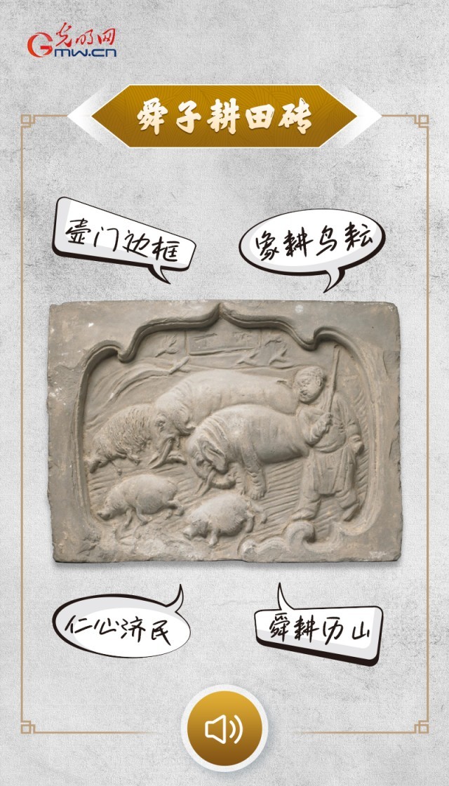 “我是刻在北宋青砖上的一则传说,壸门状的砖面里,定格下帝舜躬耕的温情瞬间。灵鸟翔于天际衔谷播种,大象躬身犁田,舜帝执鞭守望,诉说着‘象为之耕、鸟为之耘’感天动地的孝道。我以砖为纸,让‘勤劳’‘孝道’等传统美德,在古朴砖纹中静静传扬。”