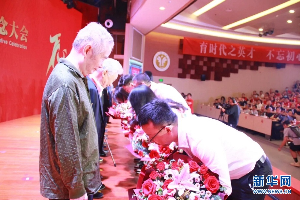在纪念大会现场,还有一个特别的环节:向11位老一辈教职工献花致敬。11位老教授、老先生在青年师生的搀扶下缓缓进场,他们是全国杰出资深法学家、98岁的金平教授,西南革大教师、94岁的黄焘副教授,西南革大干部、93岁的金生华老师,首批进入西政工作的建国初期老干部、91岁的程正宗老师,西南革大干部、87岁的娄伯箴,享受国务院政府特殊津贴人员、85岁的邹明理教授,老教授代表、84岁的吴光辉教授,81岁的左开大教授,首批当代中国法学名家、79岁的徐静村教授,享受国务院政府特殊津贴人员、79岁的文正邦教授,资深翻译家、72岁的宋雷教授。当头发花白的老教授、老先生们走上主席台时,台下响起一阵又一阵热烈的掌声。