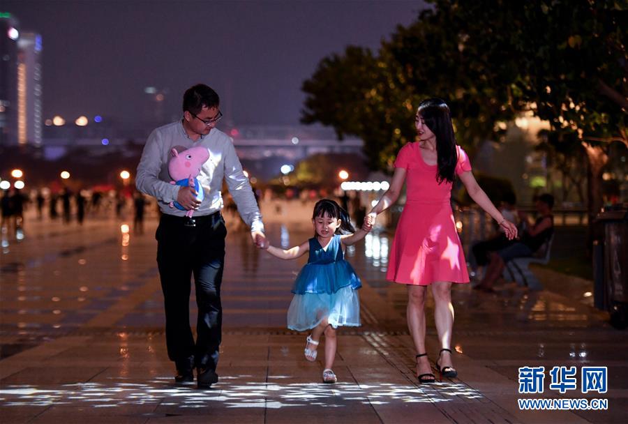 张薇夫妇带着女儿沫沫在深圳市民广场享受家人团聚的欢乐时光(9月4日摄)。新华社记者 刘大伟 摄