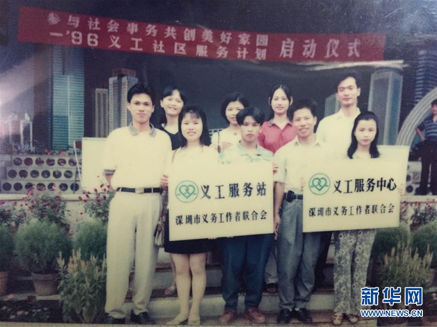 1996年8月24日,熊永兰(前排左二)从共青团深圳市委员会领取宝安区第一个社区义工服务中心(站)牌匾。新华社发(受访者供图)