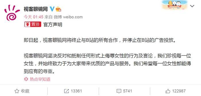 视客眼镜网称,即日起,视客眼镜网将终止与B站的所有合作,并停止在B站的广告投放。视客眼镜网坚决反对和抵制任何形式上侮辱女性的行为及言论。我们希望每一位女性都能得到应有的尊重。