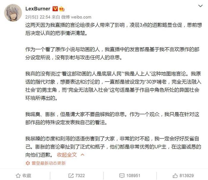 2月4日,LexBurner道歉:非常抱歉给所有人带来了不愉快,需要好好审视自己。2月5日,LexBurner再发微博,否认讲过相关言论:我真的没有说过“看这部动画的人是底层人民”“我是人上人”这种地图炮言论。但LexBurner的回应并没能让事件得以平息。