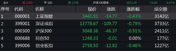 截至收盘,沪指跌0.43%,报3441.91点;深成指跌0.79%,报13778.67点;创业板指跌0.46%,报2758.50点。